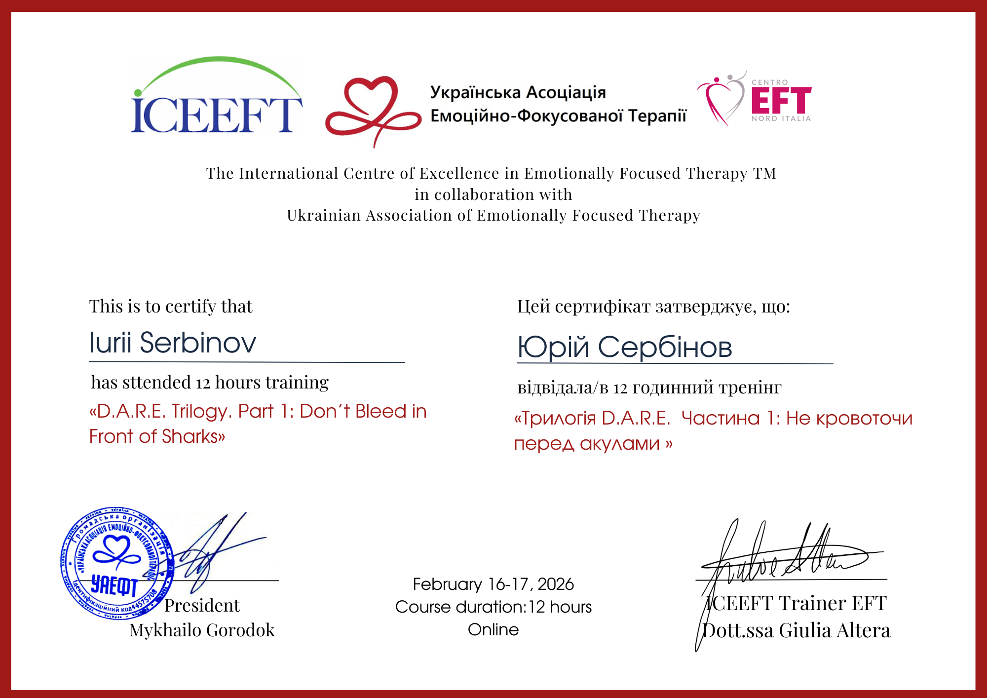 - Базовий курс з Емоційно-фокусованої терапії «Basic externship Training in Emotionally Focused Therapy» (The International Center of Excellence in Emotionally Focused Therapy, Institute for Emotionally Focused Therapy, 2024)